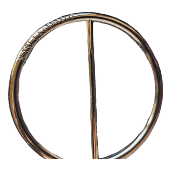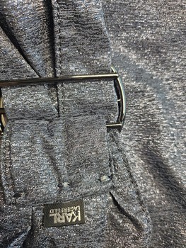 Grey shimmering waist belt with a circular metal buckle featuring Karl Lagerfeld branding.