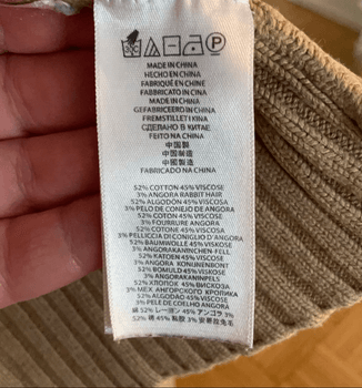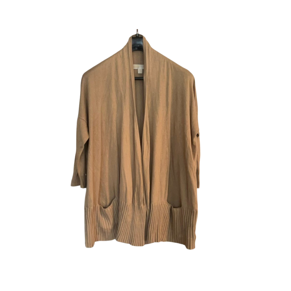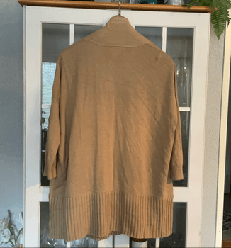 Long, open cardigan with pockets, relaxed model. In the last picture a wear is visible on the edge of one pocket. Cotton/viscose/angora.