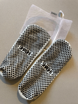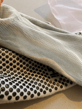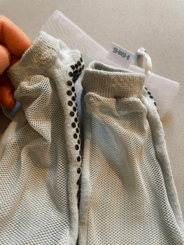 Light mint green pikatessukat. A bit loose for me. My own size is 38-39. In Shashi's size classification medium. Used and washed a couple of times, small pilling visible, but the soles are in impeccable condition.