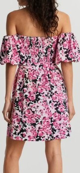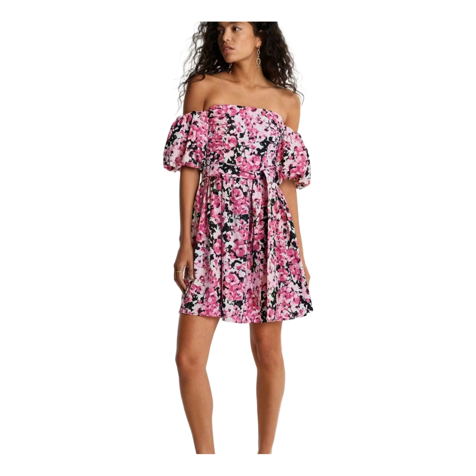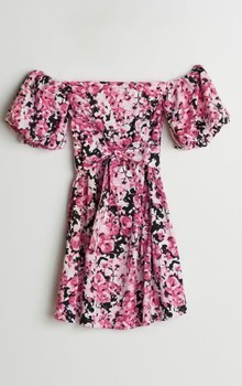 Floral print mini dress with an off-shoulder neckline and puff sleeves. Features a tie-waist detail.