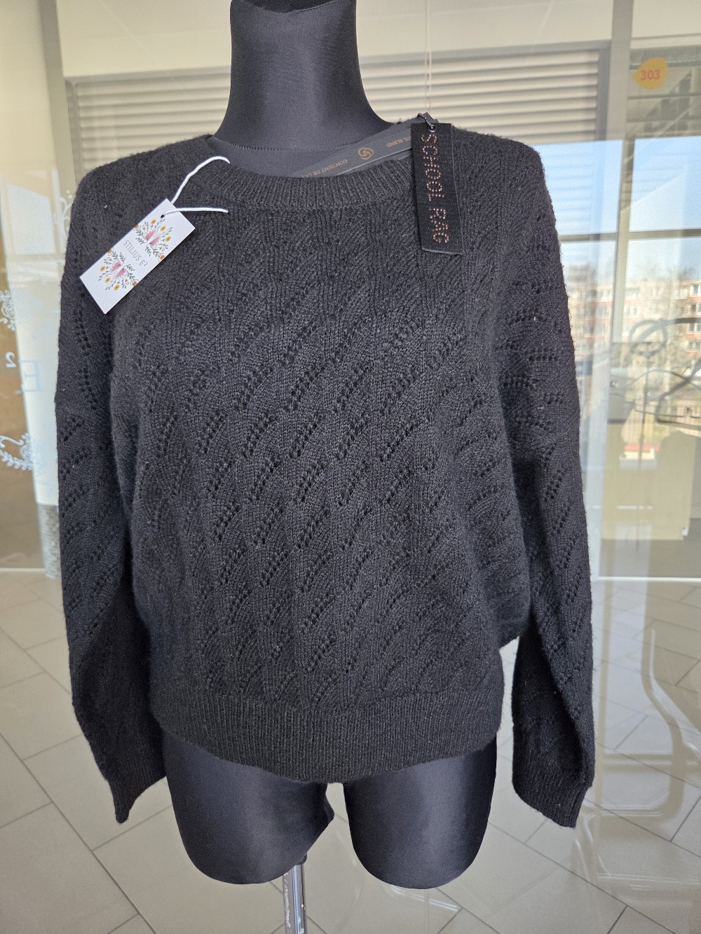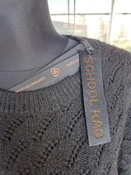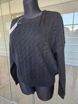 Black knitted sweater with a textured pattern. Features a crew neckline.