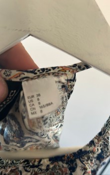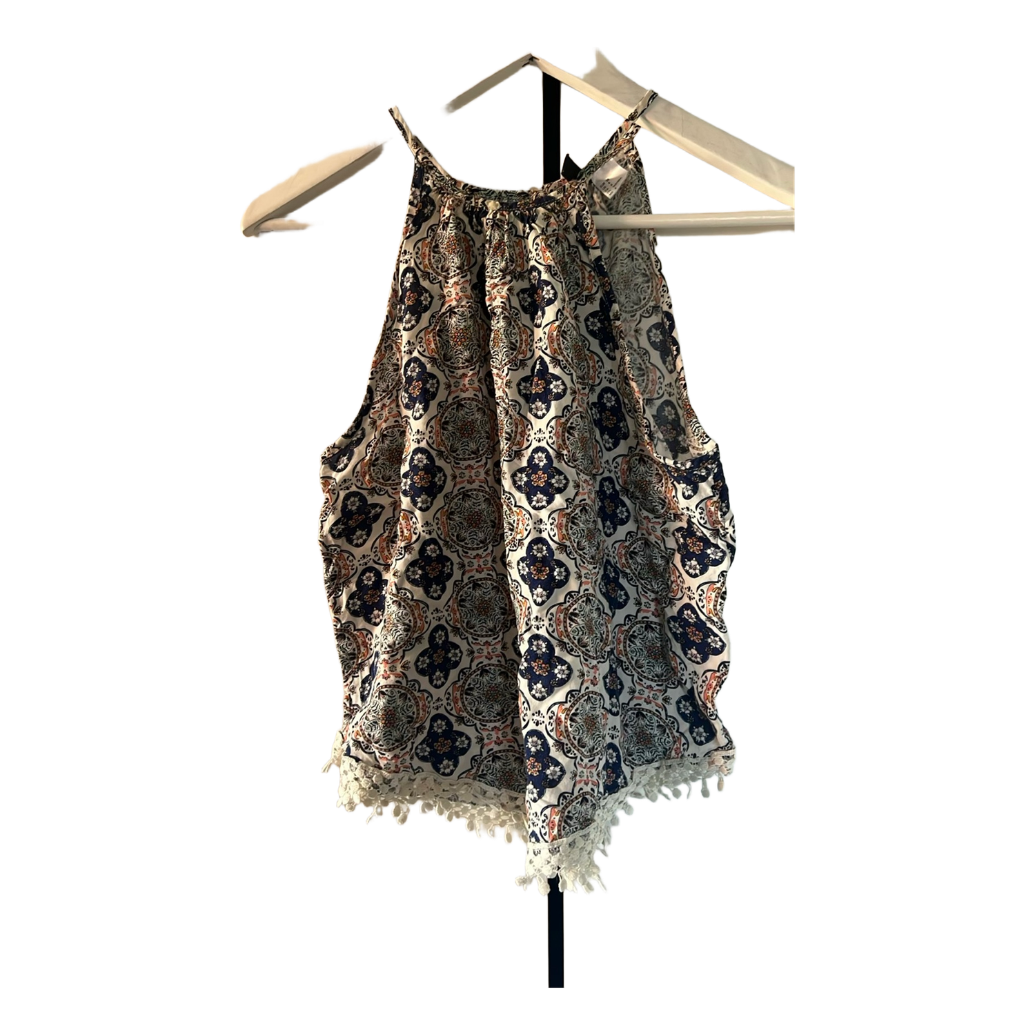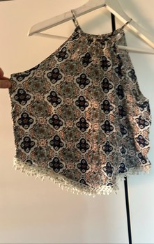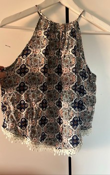 Patterned sleeveless blouse with a lace detail at the hem. Size 38.