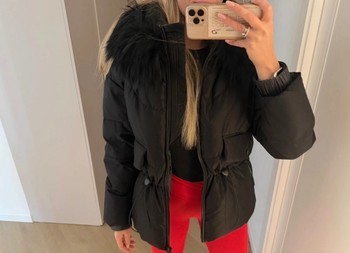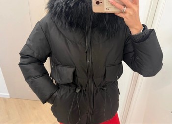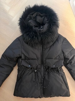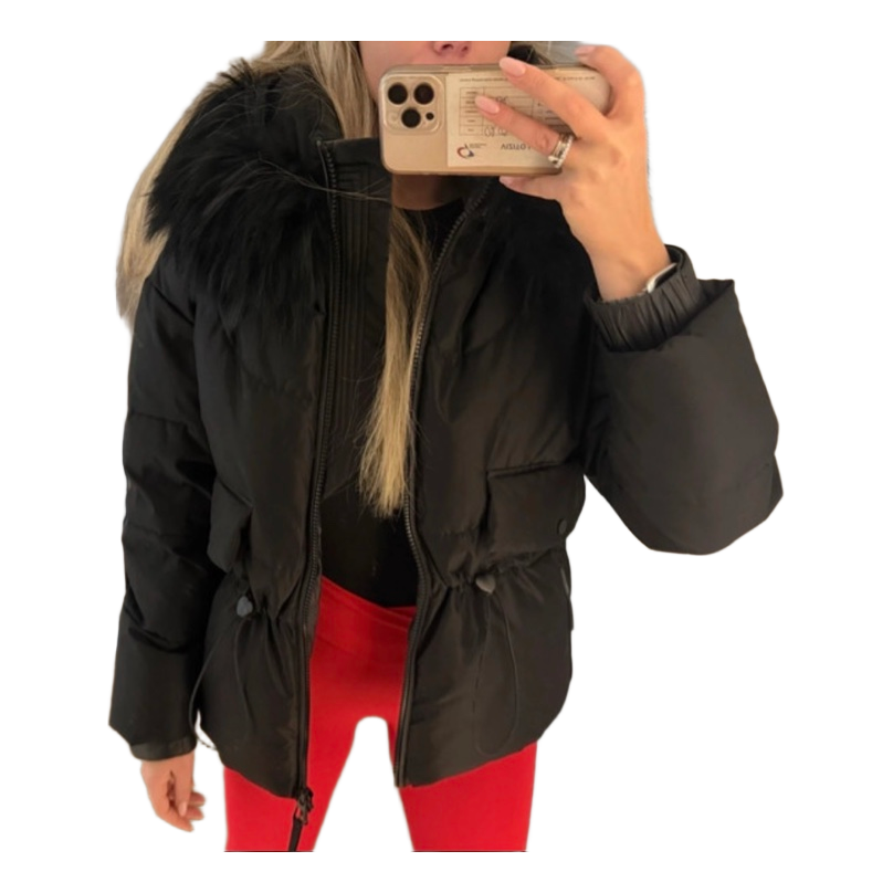 Black puffer jacket with a faux fur trim on the hood. Features a drawstring waist and two front pockets.