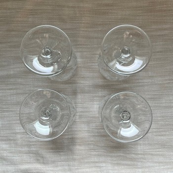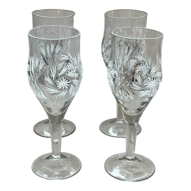 Four clear glasses with a refined engraved pattern.