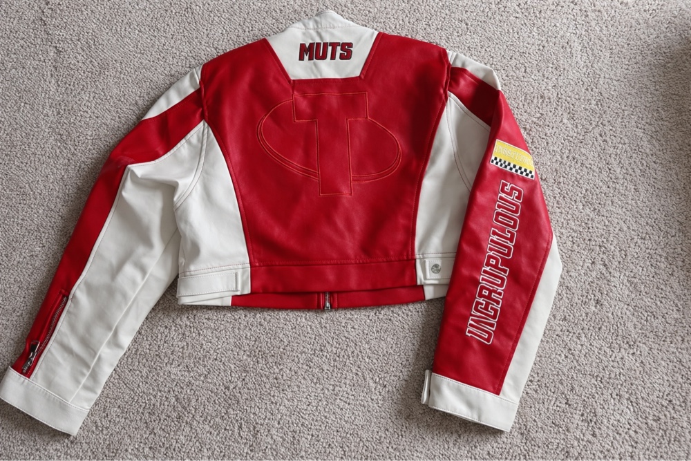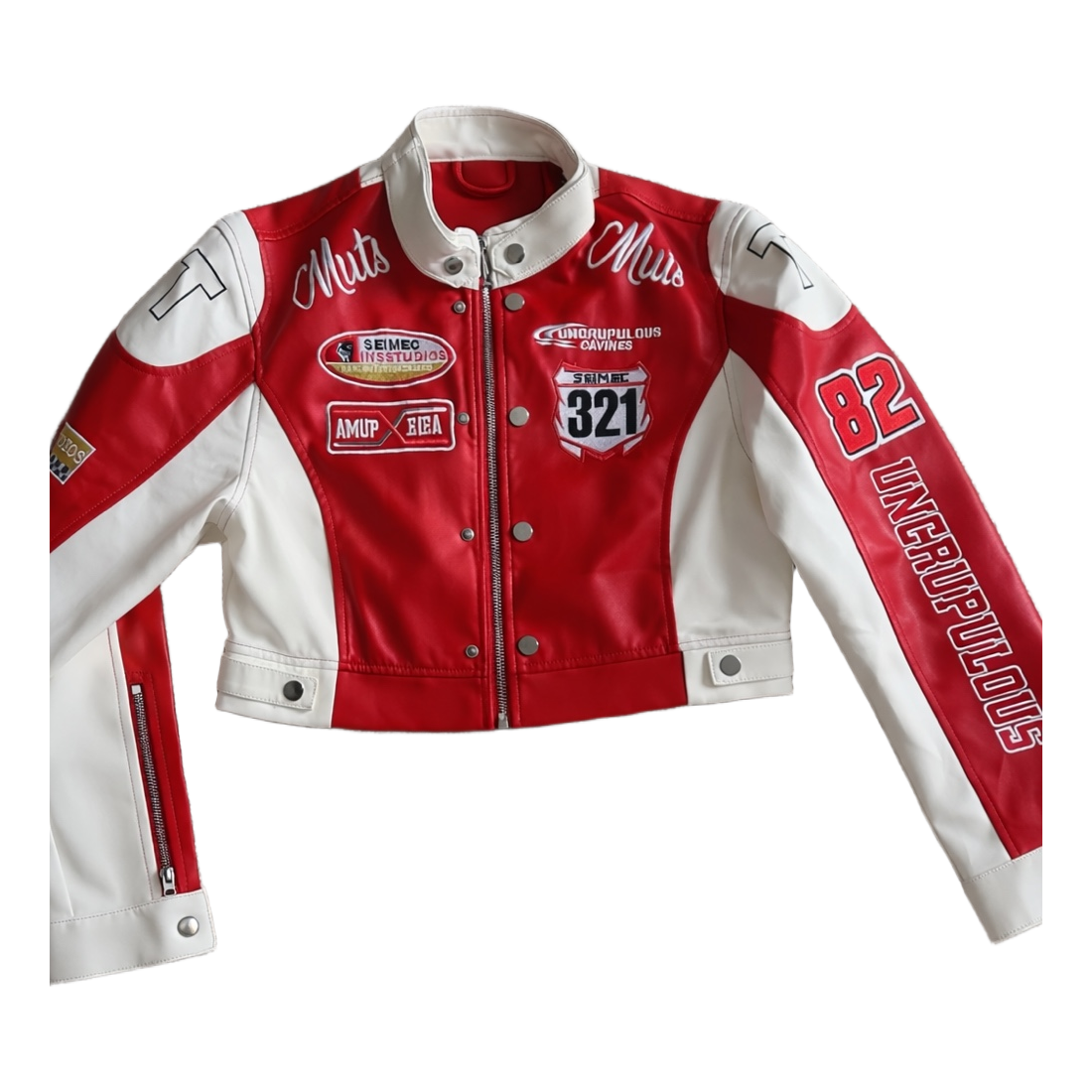 Cropped racing-style jacket with a front zip and snap button closure. Features various colorful embroidered patches and text designs.