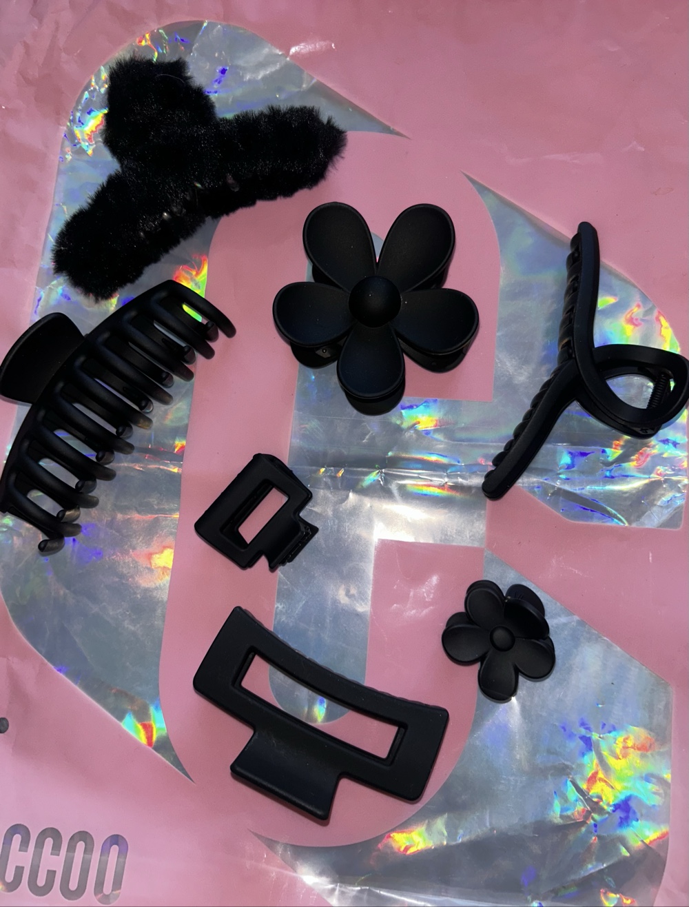 Sets of various styles of black hair clips, including fluffy, flower-shaped and classic designs. Price for 1 pc
