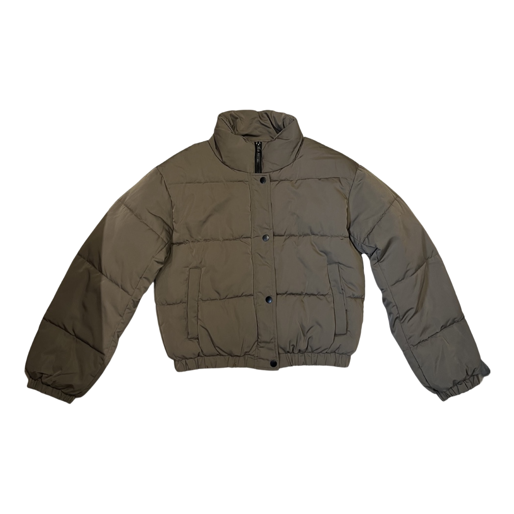 Cropped puffer jacket in khaki. Features a stand-up collar and front button closure. Size M.