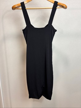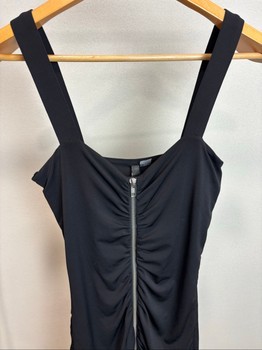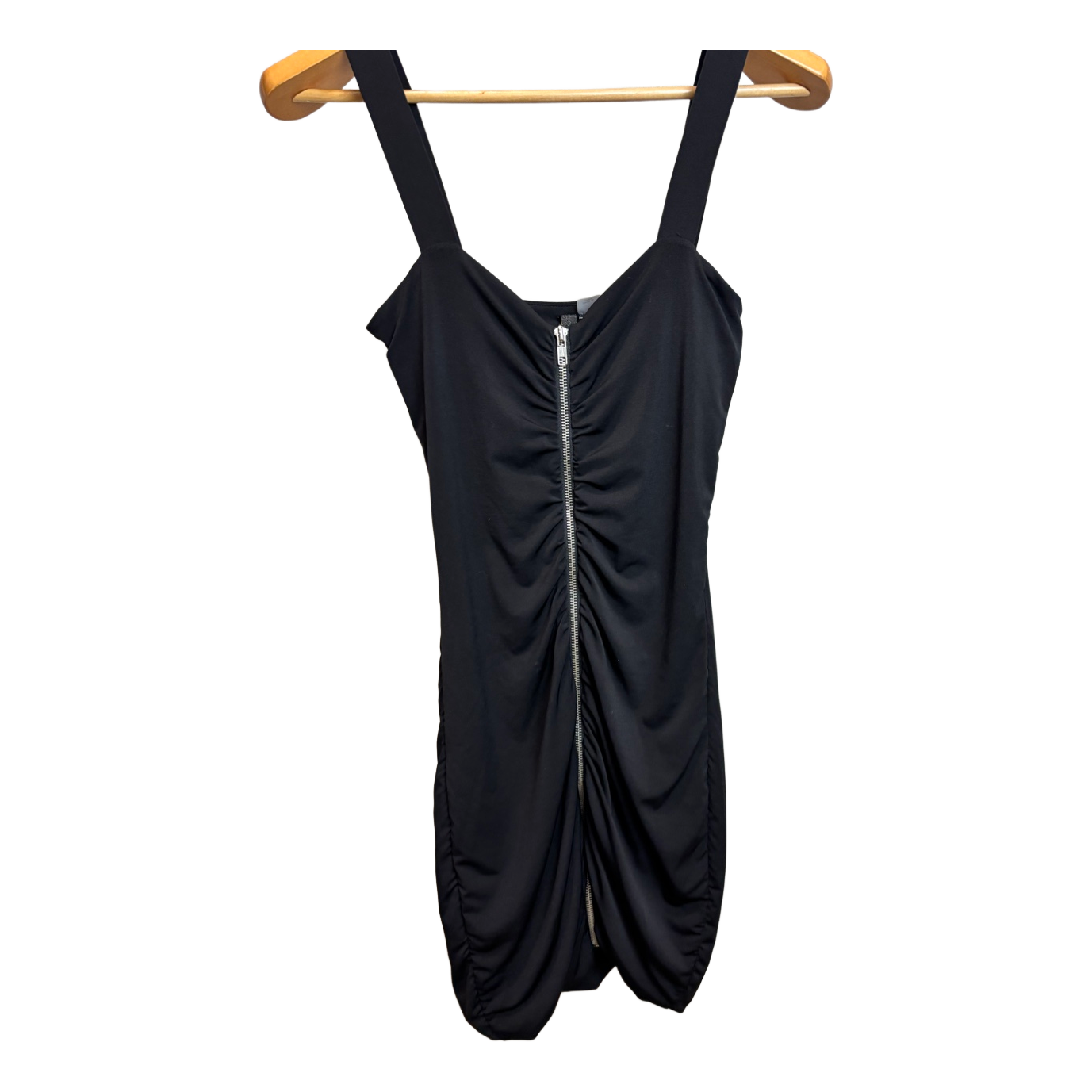 Black mini dress with front zipper and ruched detailing. Size 36.