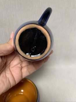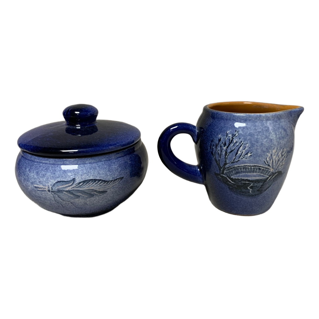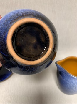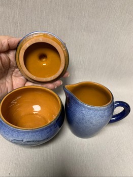 Sinine keraamiline suhkrutoos kaanega ja kann. Komplekt on seest oranži tooni.