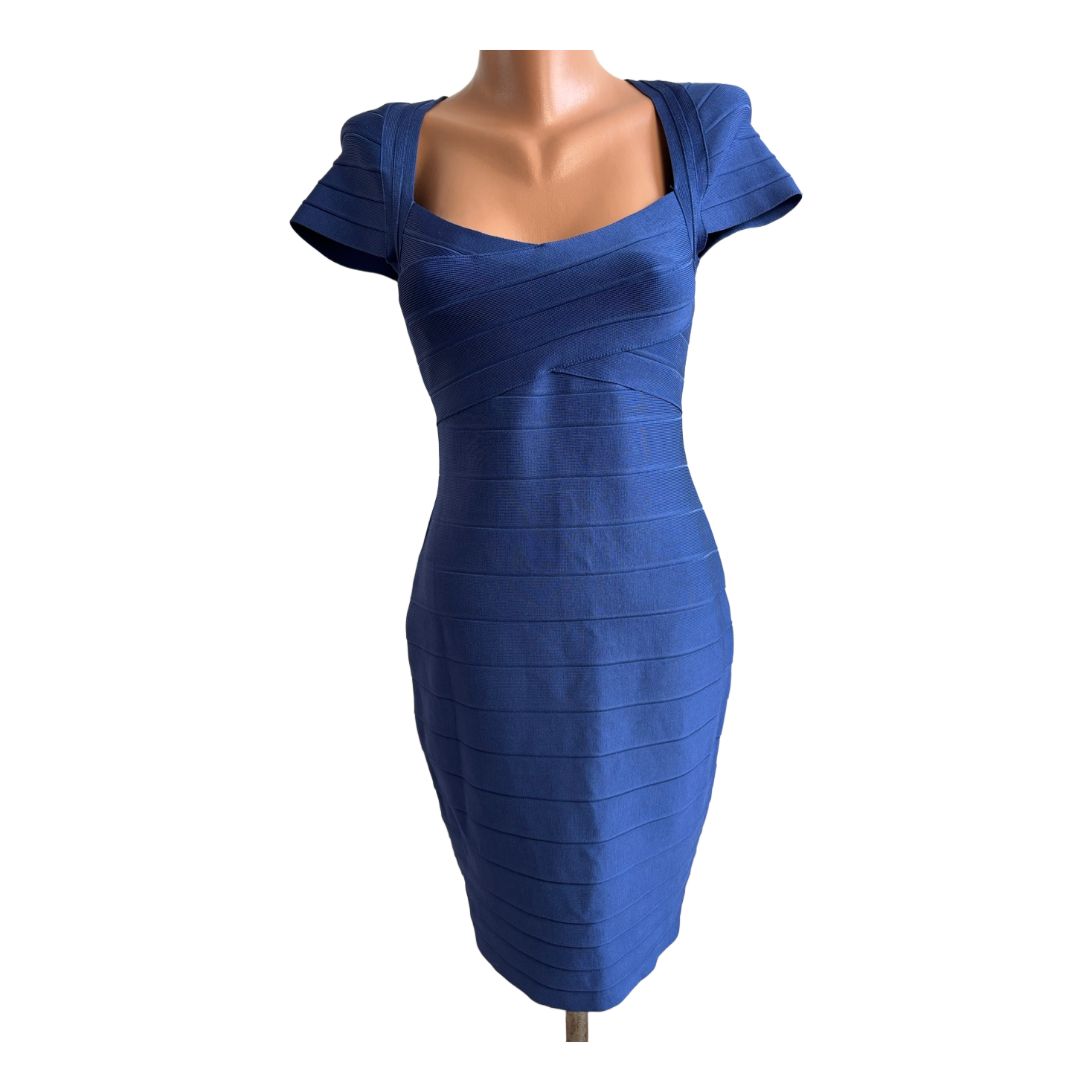 Short-sleeved bandage dress in blue. Features a zip closure on the back. Size M.
