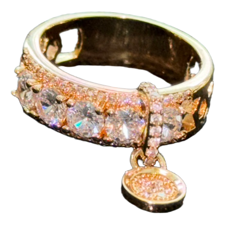 Gold plated 24 krt, Gold tone ring featuring clear crystals and a circular charm pendant.