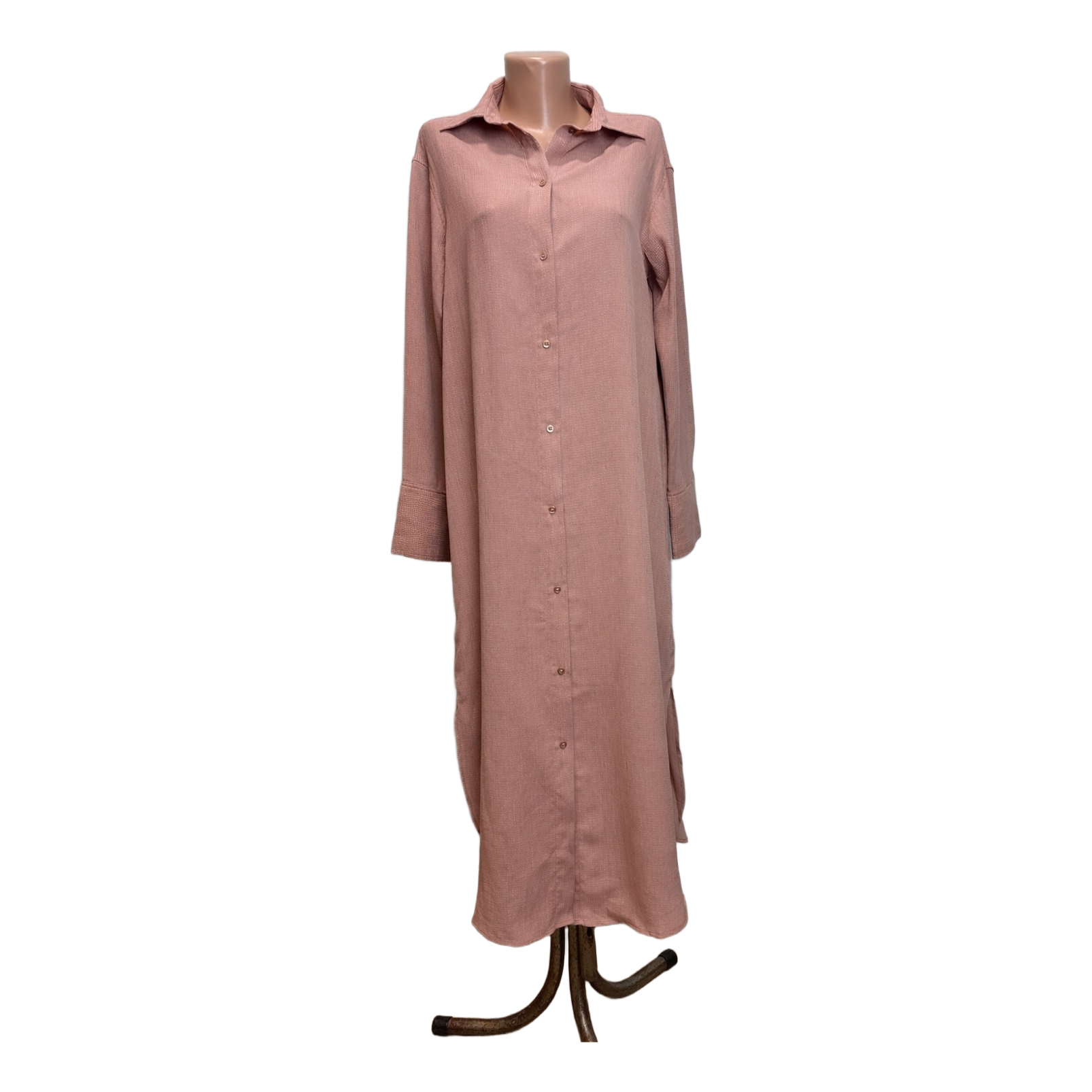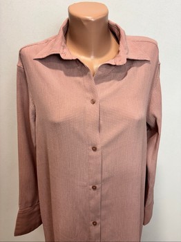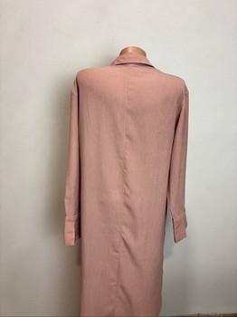 Longer shirt-dress with buttons at the front. Fabric textured, pastel pink color.