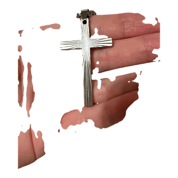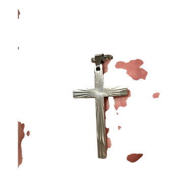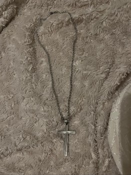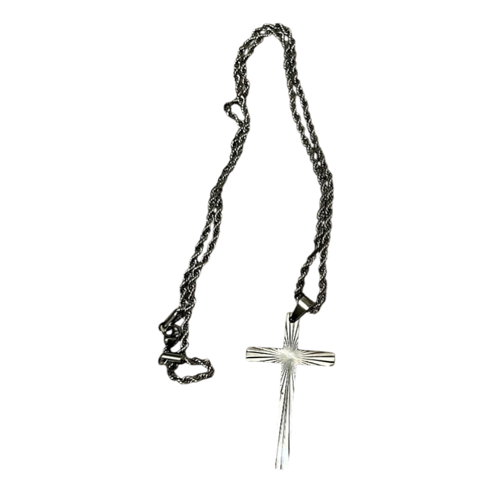Silver-colored necklace with a cross pendant patterned radially. The chain is of a twisted design.