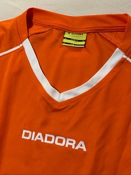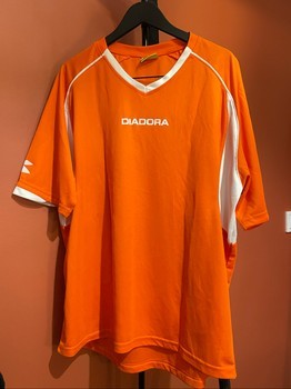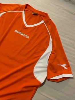 Short-sleeved oversized sports shirt in orange with white detailing. Features a V-neck and the brand logo on the front.