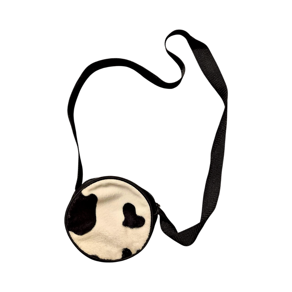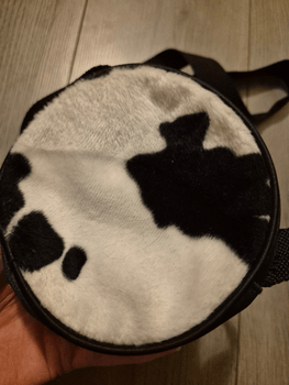 Small bag with cow pattern. Unfortunately no information about the origin, I bought it at a flea market and there are no tags. The strap cannot be adjusted. The bag has a zipper. Width/Height approx 14 cm.