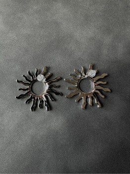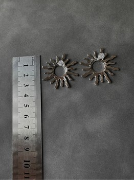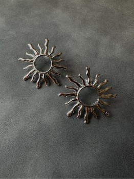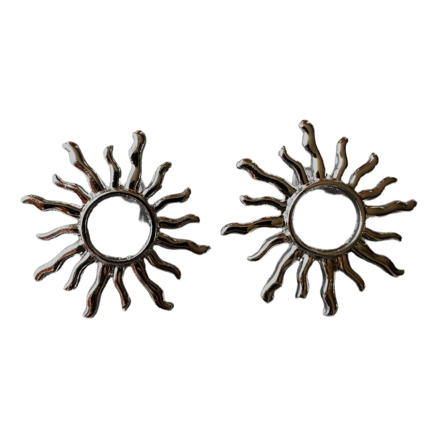Silver-toned stud earrings shaped like a sun. Features a circular center with radiating rays.