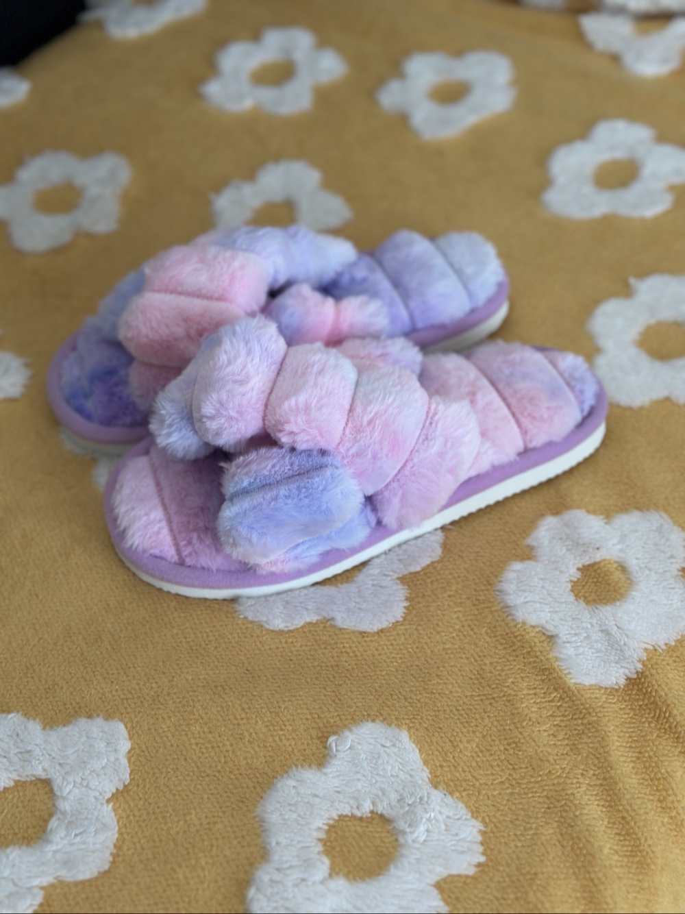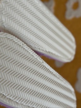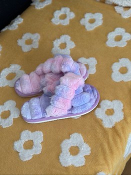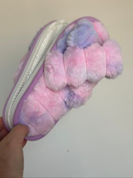 Light pink and purple fluffy slippers. Patterned sole.
