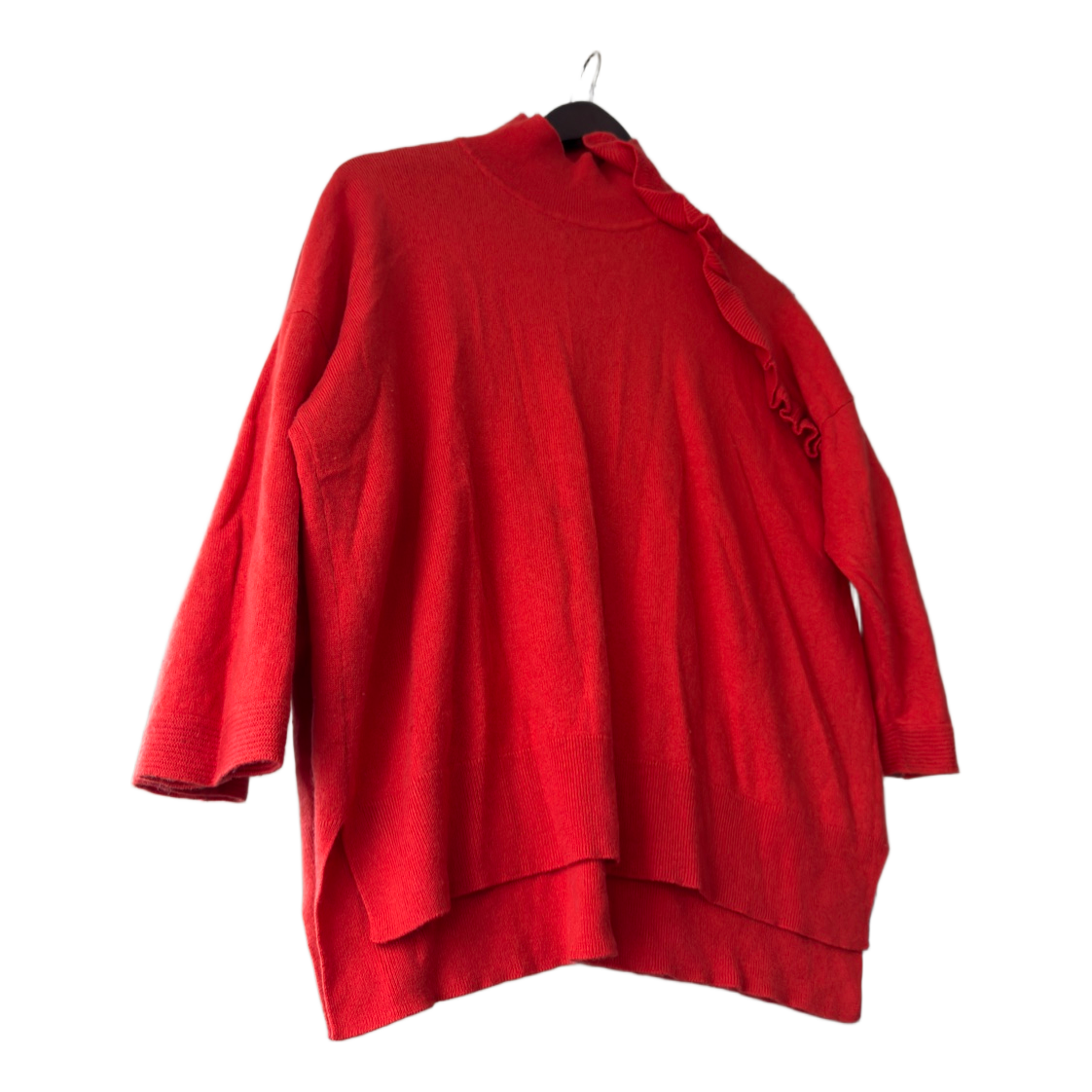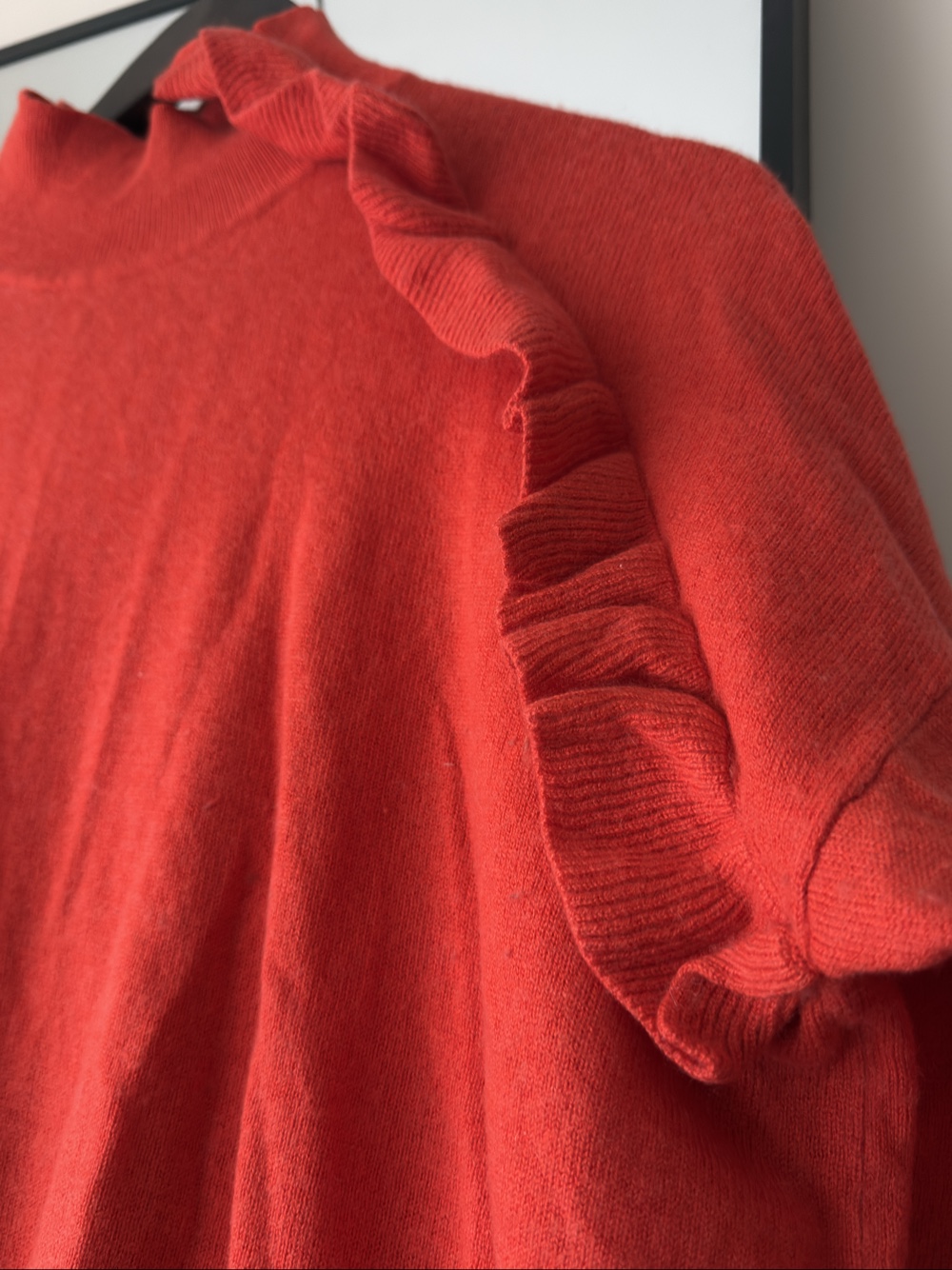 Red sweater featuring ruffled shoulder detailing and a mock neckline. The knit has a slightly dropped hem.