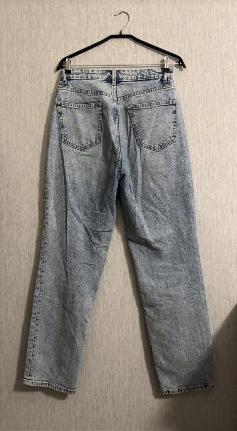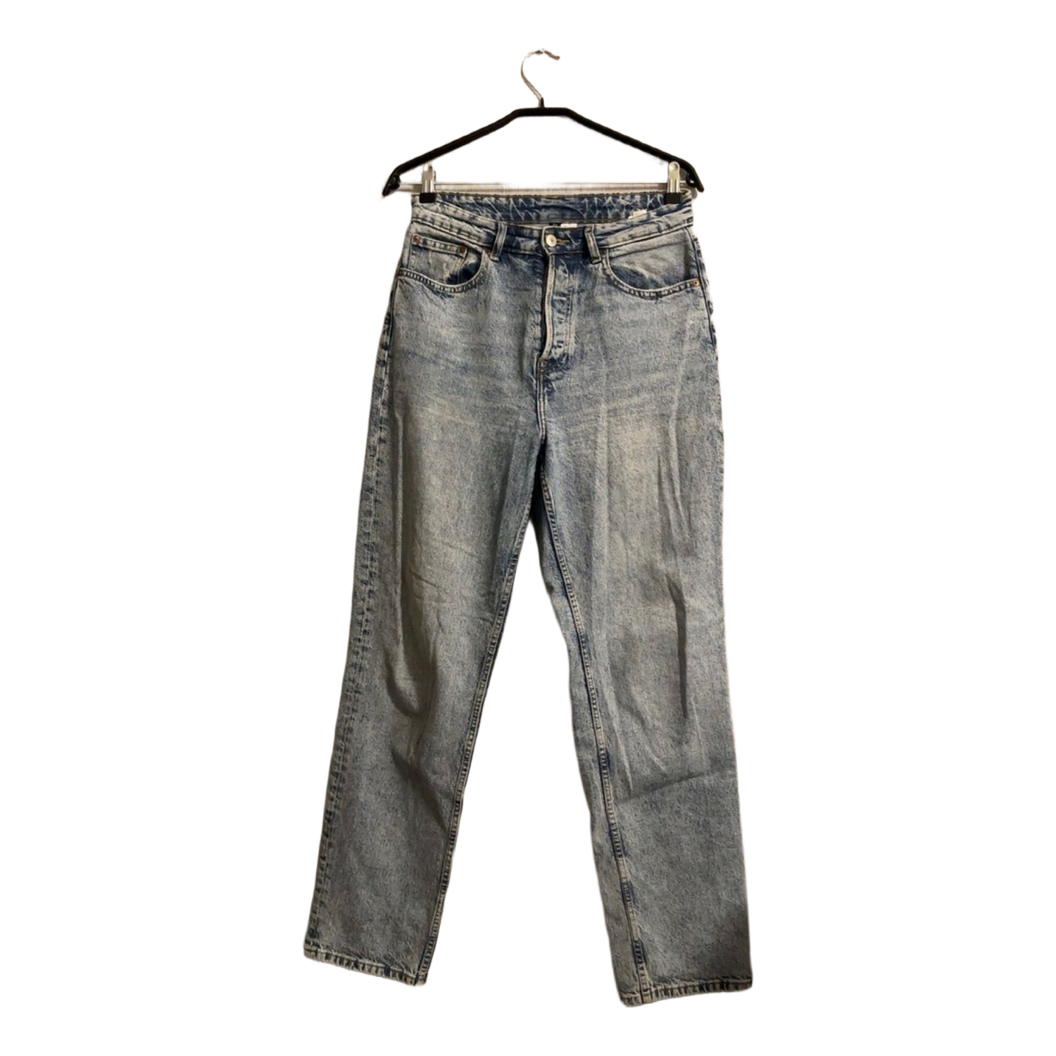 High-waist jeans in a light blue acid wash finish. Straight-leg fit with classic five-pocket styling.