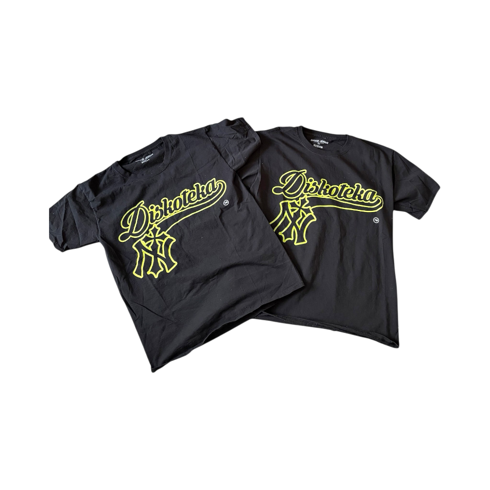 Black T-shirt, with yellow logo. Comfortable and relaxed model.
