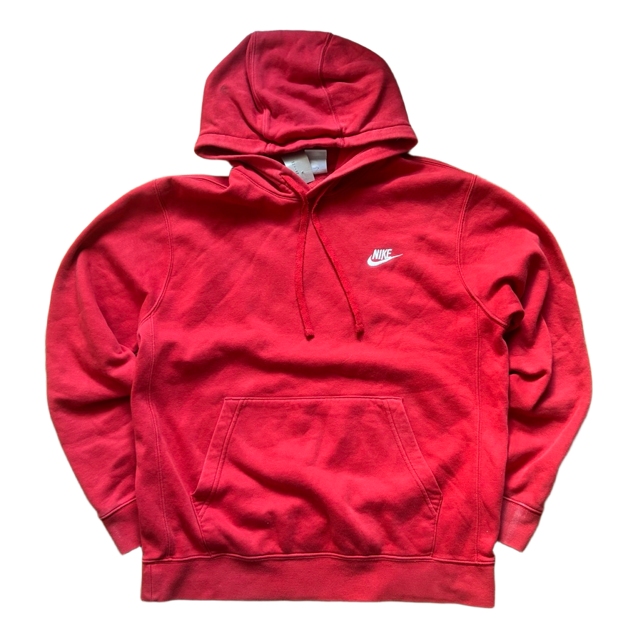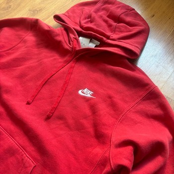 Red hooded sweatshirt with front kangaroo pocket and Nike logo on the chest. Size S.