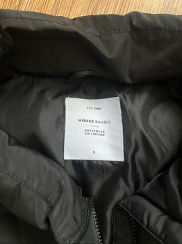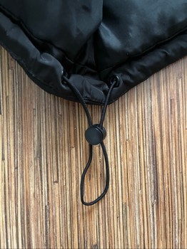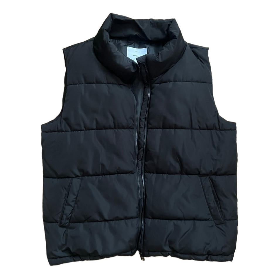 Black puffer vest with a front zip and high collar. Features an adjustable drawstring at the hem. Size L.