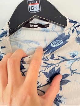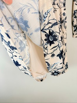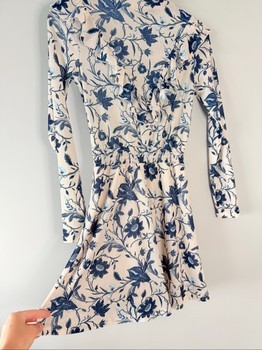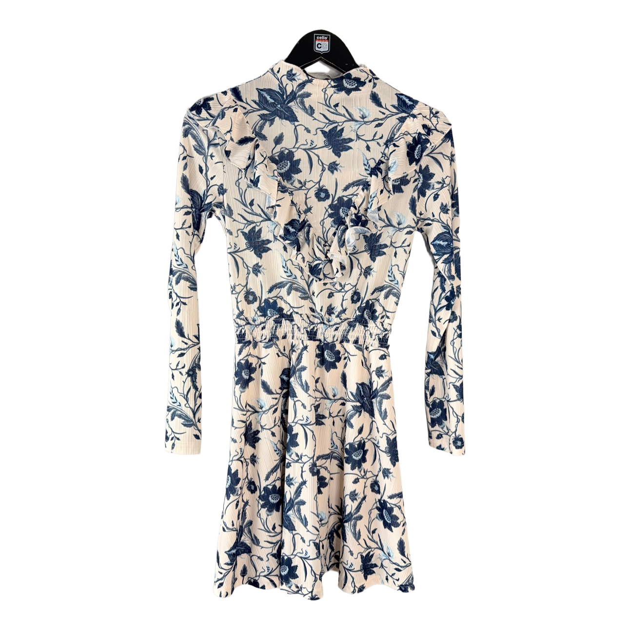 Long-sleeved floral mini dress with ruffled details and an elasticated waist. Cream and blue color pattern. Size XS.
