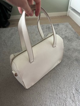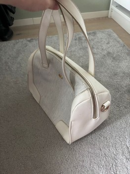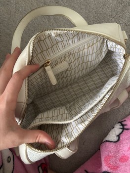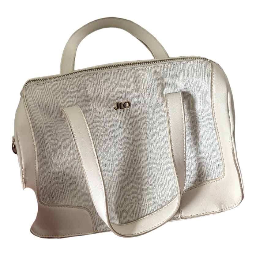 White JLO handbag. Zipper closure mechanism and patterned inner lining.