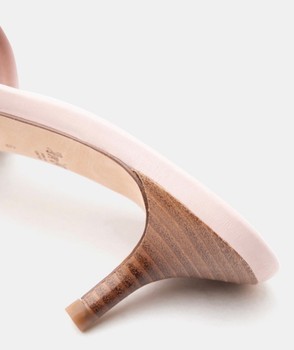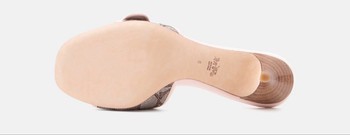 Pink slide sandals with gold buckle detail and monogram print. Features a wooden heel. Size 6.