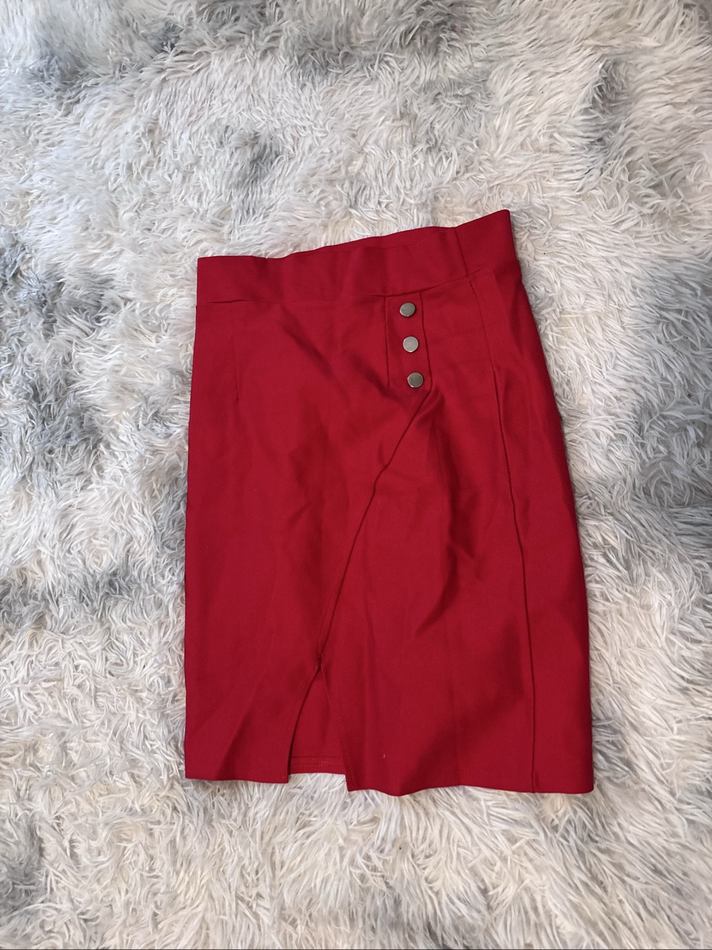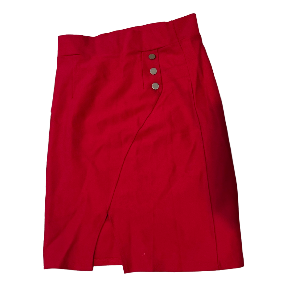 Red skirt featuring a front slit and button details.