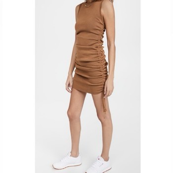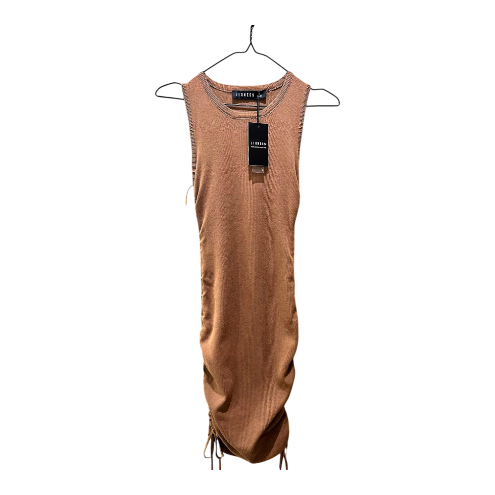 Sleeveless brown knit dress with a round neck. Features ruched sides with tie details. Made from 89% Viscose and 11% Nylon.