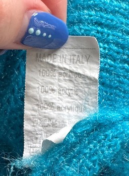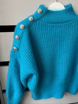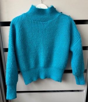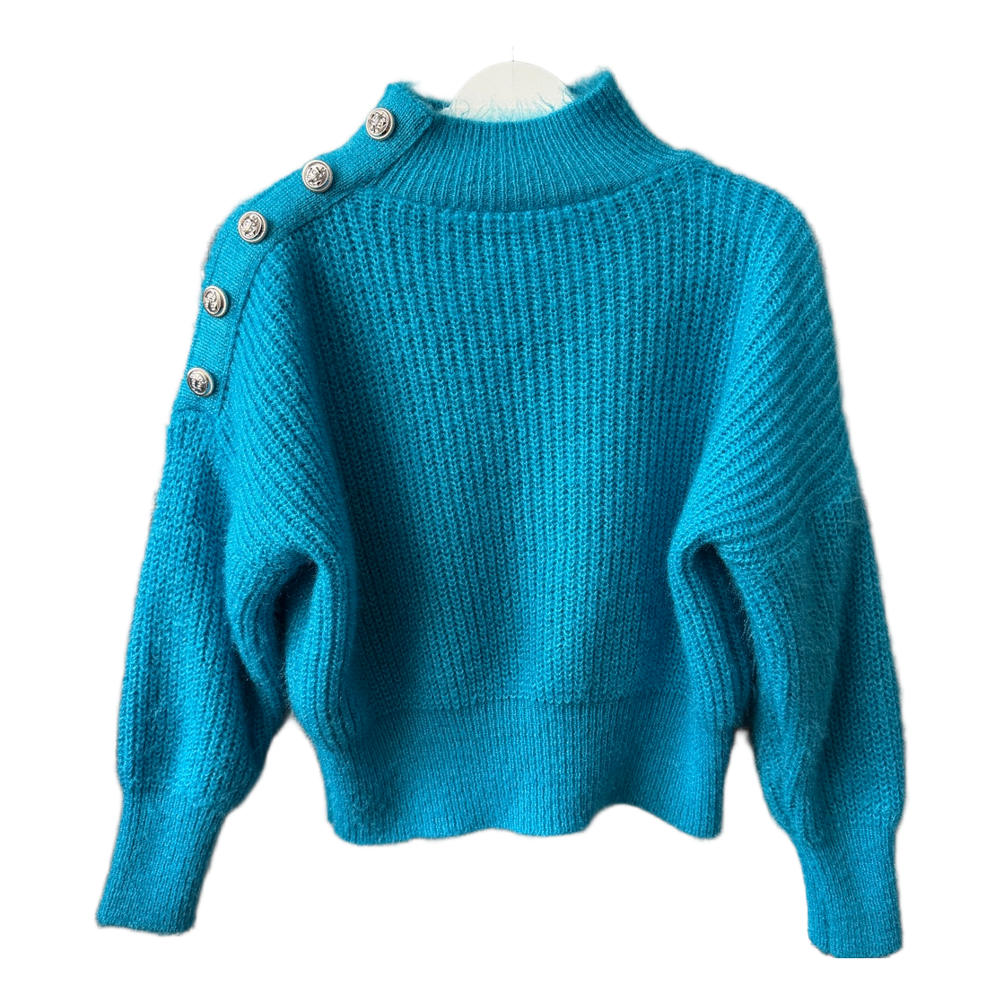 Turquoise knit sweater with button details on the shoulder. Made of 100% acrylic. Size S/M