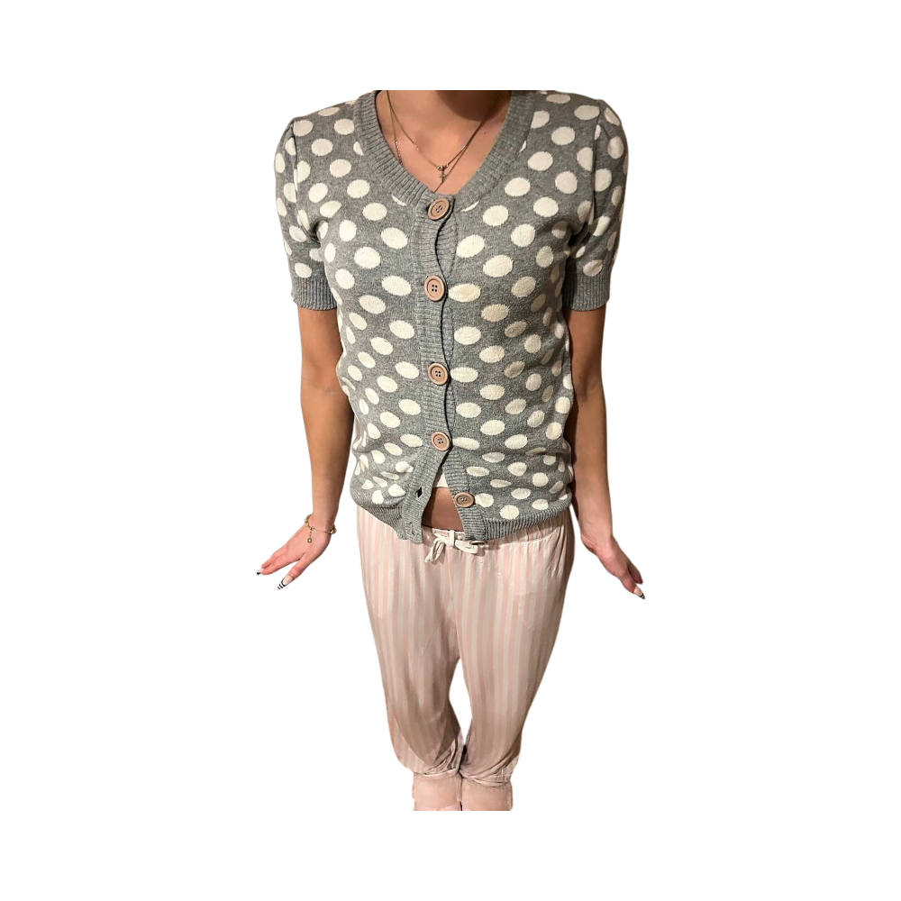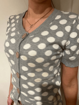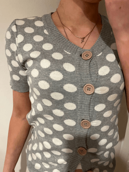 Grey shirt with white dots. Short-sleeved model, buttons in front.
