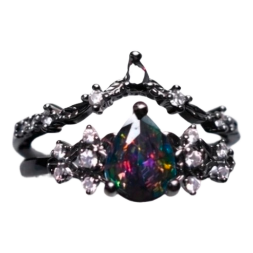 Black metal ring set featuring a teardrop-shaped iridescent stone and clear decorative stones.