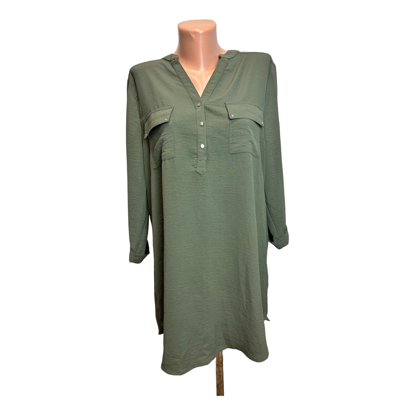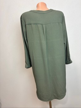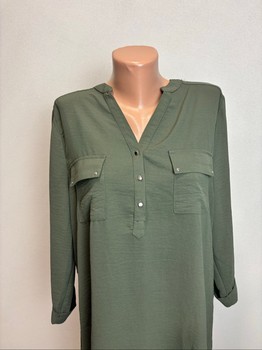 Green tunic shirt with front pockets and button detail. Long sleeves with roll-up feature. Size 40/L.