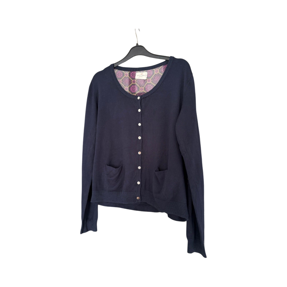 Navy cardigan with a sheer, abstract pattern on the back by Lindex. Elegant and lightweight, perfect for layering. Good condition with some wear on the gold-colored buttons. Size large.