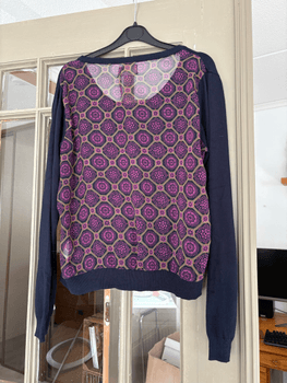 navy cardigan, sheer back knit, abstract pattern sweater, Lindex knitwear, gold button cardigan, large size knit, viscose blend sweater, lightweight cardigan, layering piece, elegant knit