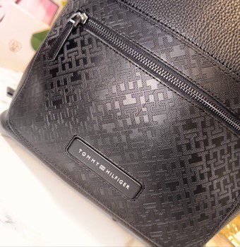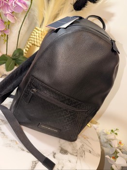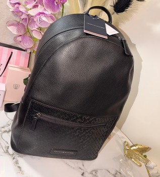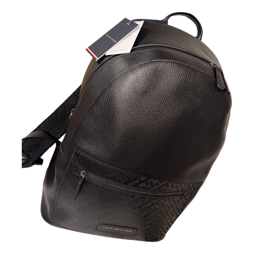 Tommy Hilfiger backpack in black with textured monogram pattern. Front zippered pocket and brand logo plate. New with tags.
