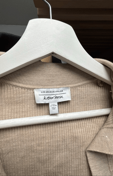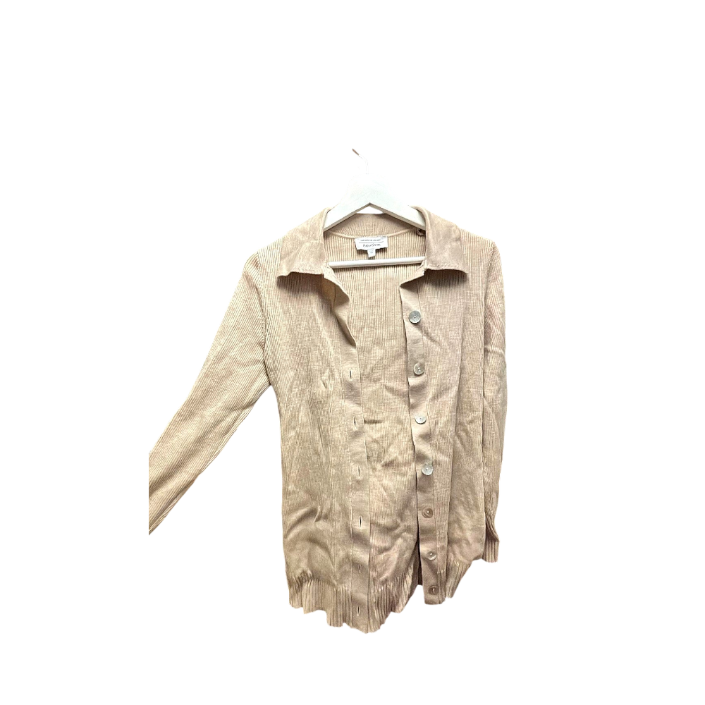 Cardigan featuring a ribbed texture with button-up front and a collared design. Soft beige color with a relaxed fit.