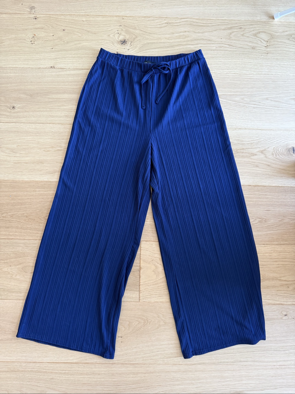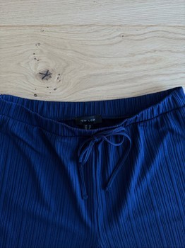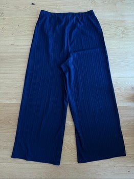 Pleated wide-leg trousers in navy blue. Features an elasticated waist with a drawstring. Size 38.