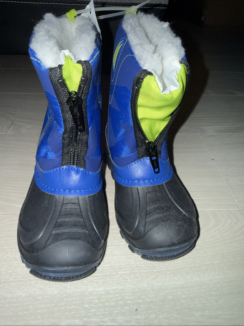 Children's winter boots in blue and black with front zipper and faux fur lining.