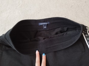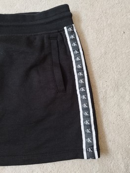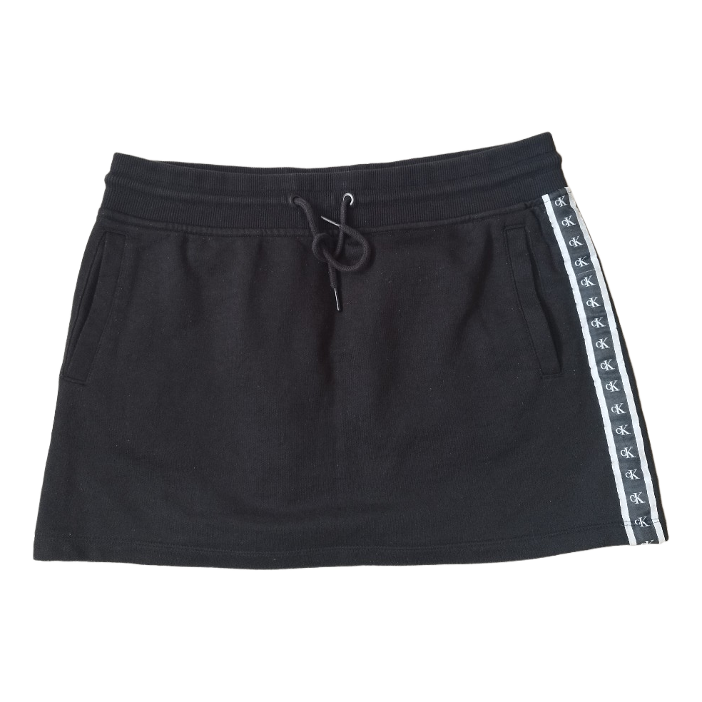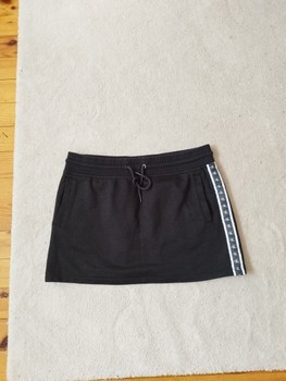 Black skirt with drawstring waistband and side logo stripe. Features two side pockets. Size L.