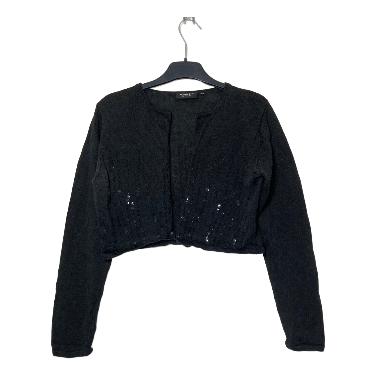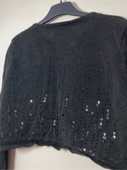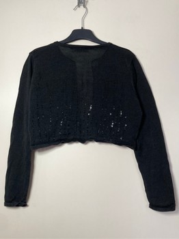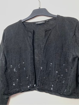 Number One by Kappahl black long-sleeved bolero. Black sequins and pearls. No closure. 60% linen (ramie) and 40% viscose. Typical for linen the color is not completely even. Good condition, slight marks at the underarms. Size 38/40. Underarm-to-underarm measurement at back unstretched about 50 cm. Length about 40 cm. Sleeve length from underarm about 48 cm.