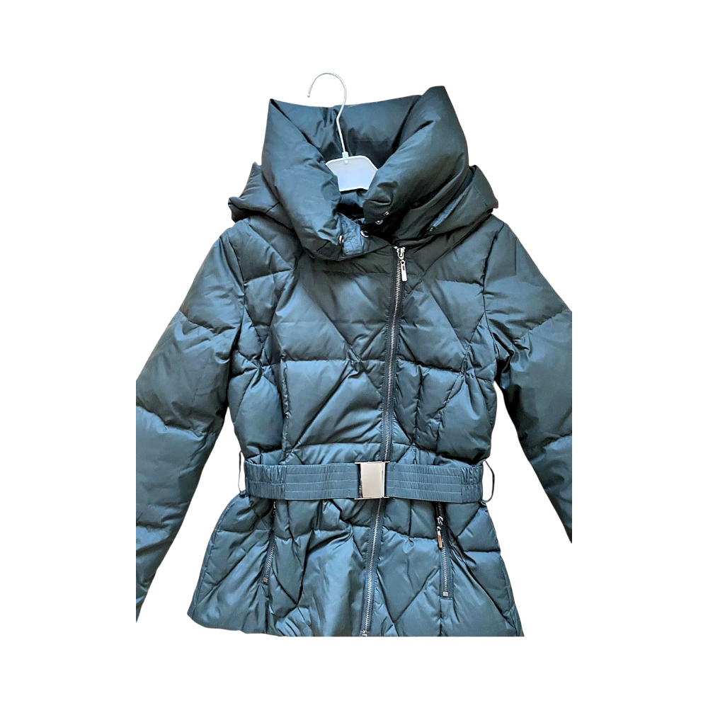 Jacket featuring a grey color with a hood. Includes a zip front closure, side pockets, and a belt at the waist. Monton ziemas jaka, S izmērs. Ar kapuci un jostiņu. Pildījums 70 dunas, 30 spalvas. 20 eur. 70% down