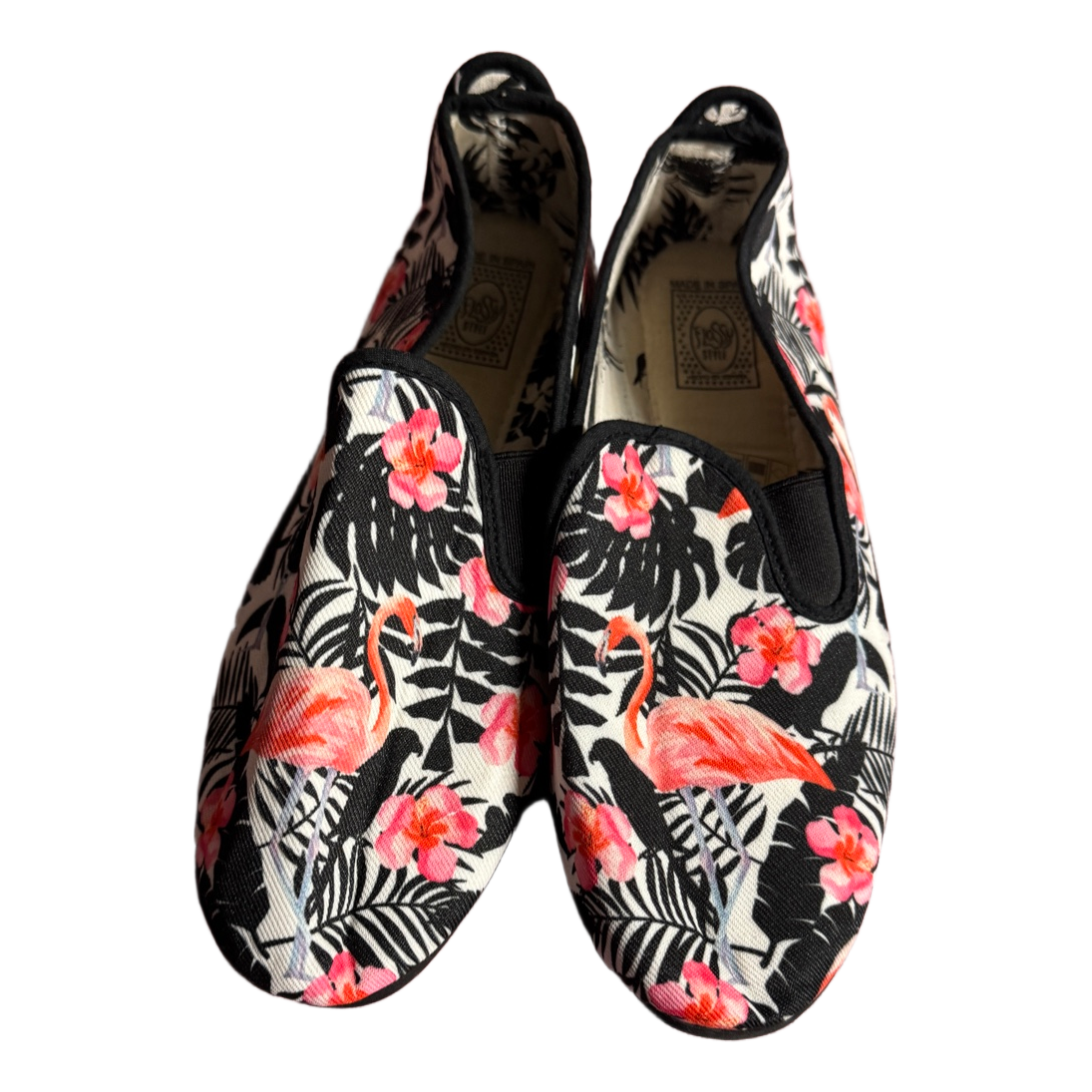 Black and white floral print slip-on shoes featuring pink flamingos. Comfortable casual flat shoes.