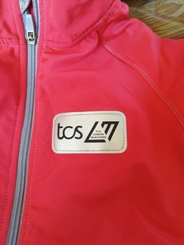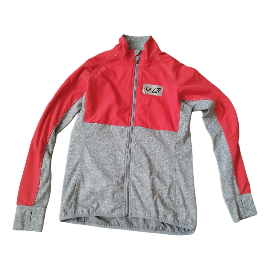 TCS London Marathon zip-up sports jacket in red and grey. Features long sleeves with thumb holes.