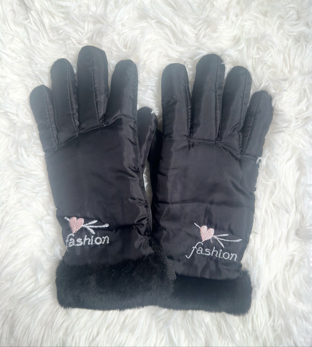 Black quilted winter gloves featuring a decorative heart design and faux fur trim at the cuffs.