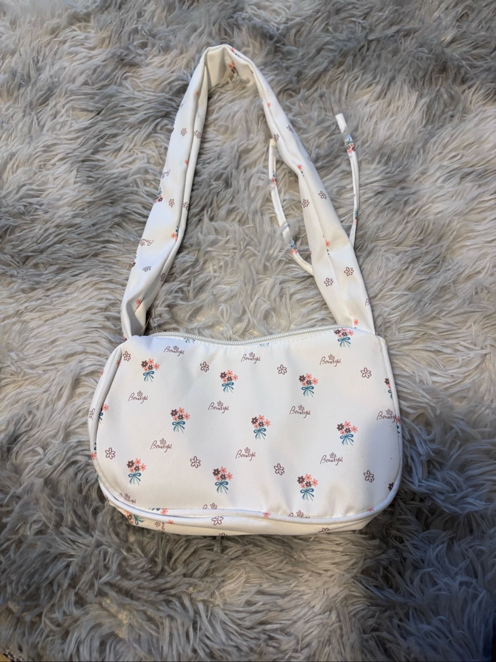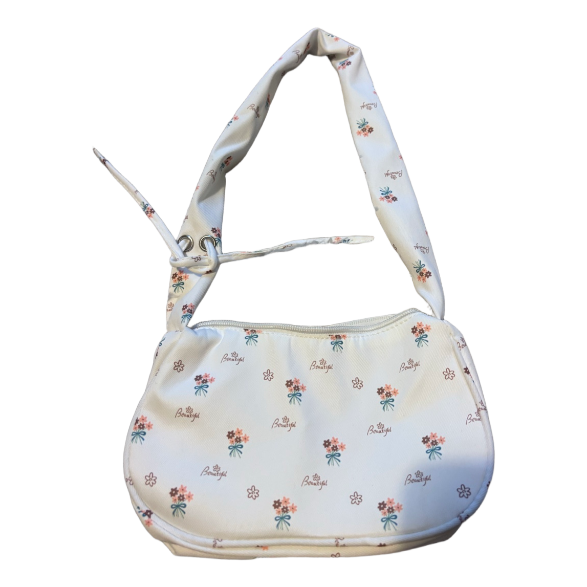 Small white shoulder bag featuring a floral and text pattern. Zipper closure.