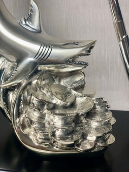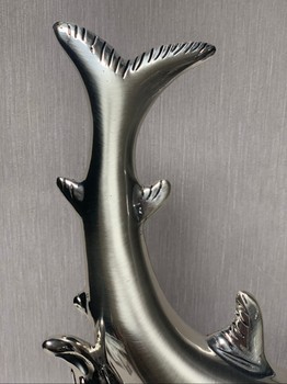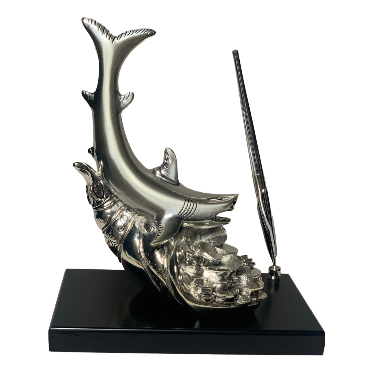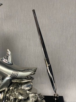 Desk ornament featuring a silver shark sculpture with a matching pen. Mounted on a black base. Includes the original gift box.