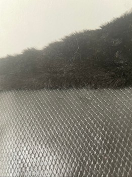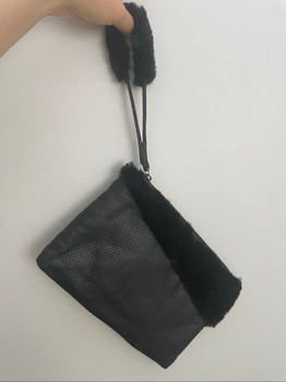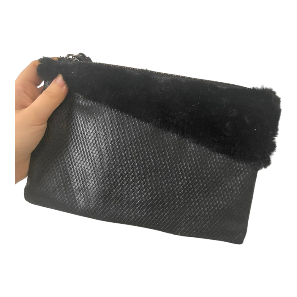 Black faux leather bag with faux-fur details and a strap that can be slipped over the wrist